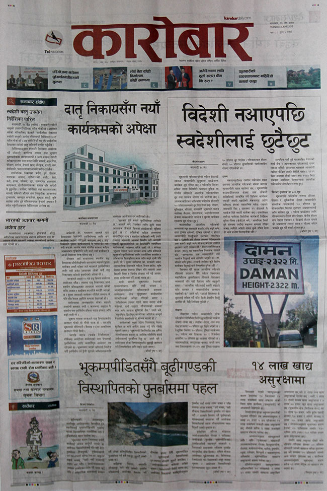 कारोबार दैनिकमा दातृ निकायसँग नयाँ कार्यक्रमको अपेक्षा, विदेशी नआएपछि स्वदेशीलाई छुटैछुट, भूकम्पपीडितसँगै बूढीगण्डकी विस्थापितको पुनर्बास पहल, १४ लाख खाद्य असुरक्षा, परियोजना नरोक्न पूर्वअर्थमन्त्रीहरुको सुझाव, शीर्ष नेता कोही निर्माणमा-कोही भ्रमणमा, फूलबारीको ब्वयवस्थापनबाट बाहिरियो क्लार्क समूह लगायतका खबर छन् ।