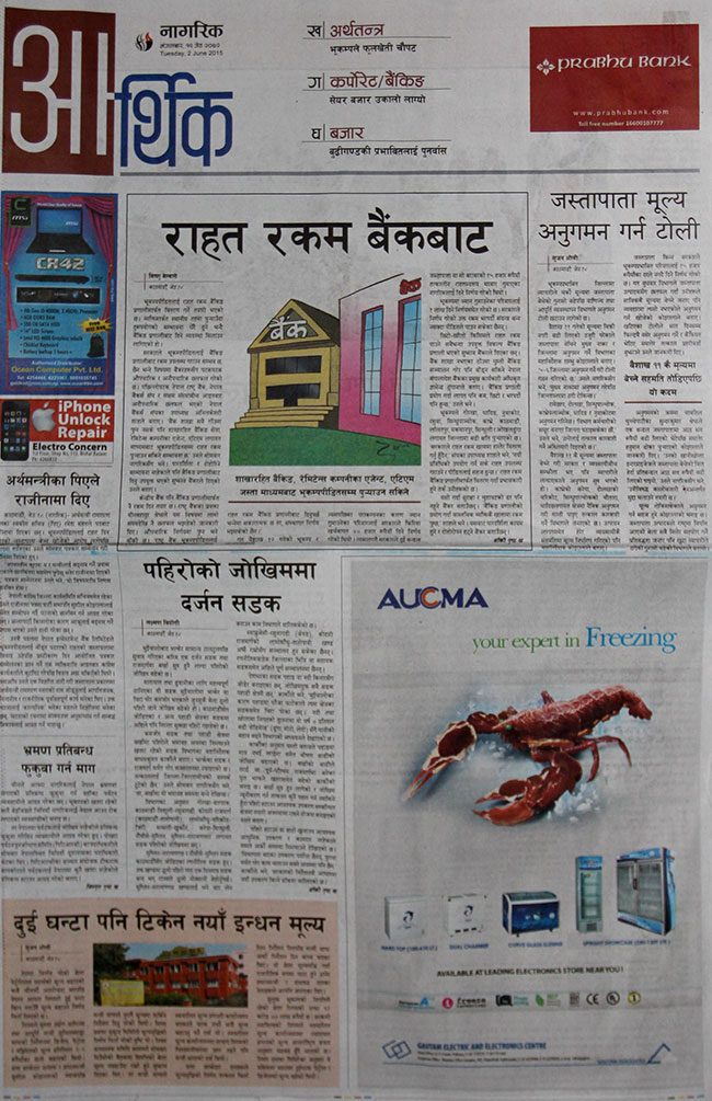 नागरिक दैनिकमा राहत रकम बैंकबाट जस्तापाता मूल्य अनुगमन गर्न टोली, पहिरोको जोखिममा दर्जन सडक, दुई घण्टा पनि टिकेन नयाँ इन्धन मूल्य, भूकम्पले फूलखेती चौपट, सेयर बजार उकालो लाग्यो, बुढीगण्डकी प्रभावितलाई पुनर्वास लगायतका खबर छन् ।
