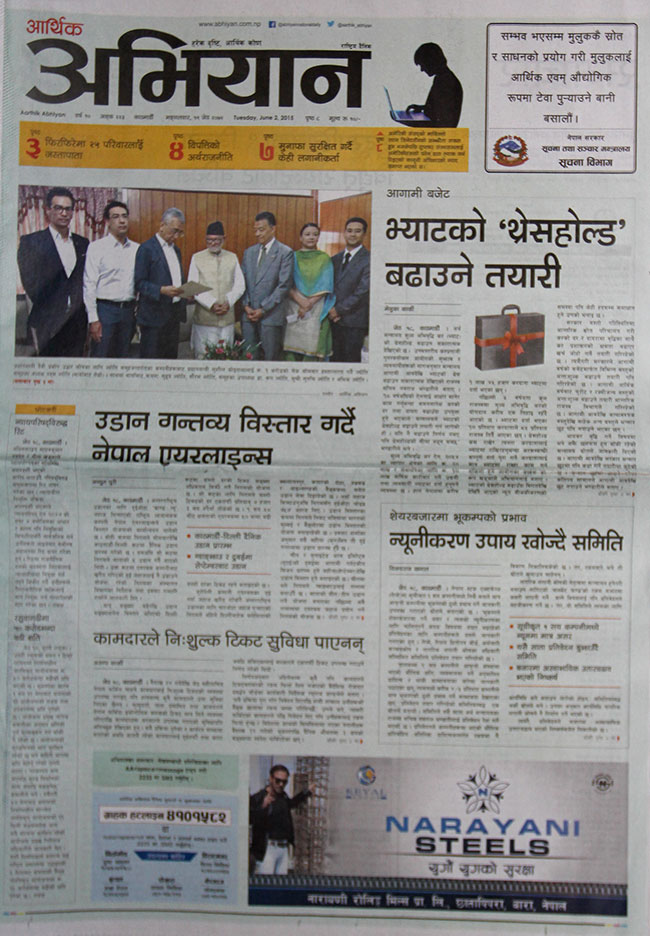 आर्थिक अभियानमा आगामी बजेटमा भ्याटको थ्रेसहोल्ड बढाउने तयारी, उडान गन्तब्य विस्तार गर्दै नेपाल एयरलाइन्स, कामदारले निःशुल्क टिकट सुविधा पाएनन्, शेयरबजारमा भूकम्पको प्रभाव, फिरफिरेमा २५ परिवारलाई जस्तापाता, मुनाफा सुरक्षित गर्दै केही लगानीकर्ता लगायतका खबर छन् ।